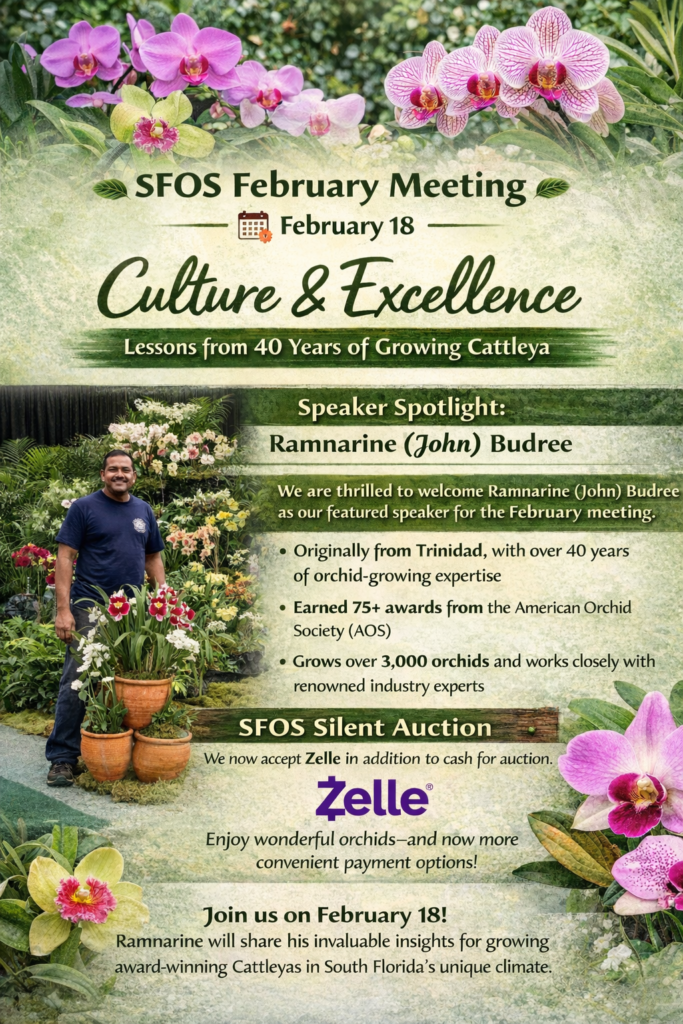 And don’t forget — the Redland International Orchid Festival is coming October 17–19 at the Fruit & Spice Park. Each SFOS member who volunteers their time receives free admission to the Festival for that day, and the Society earns $65 for each member who volunteers as well!